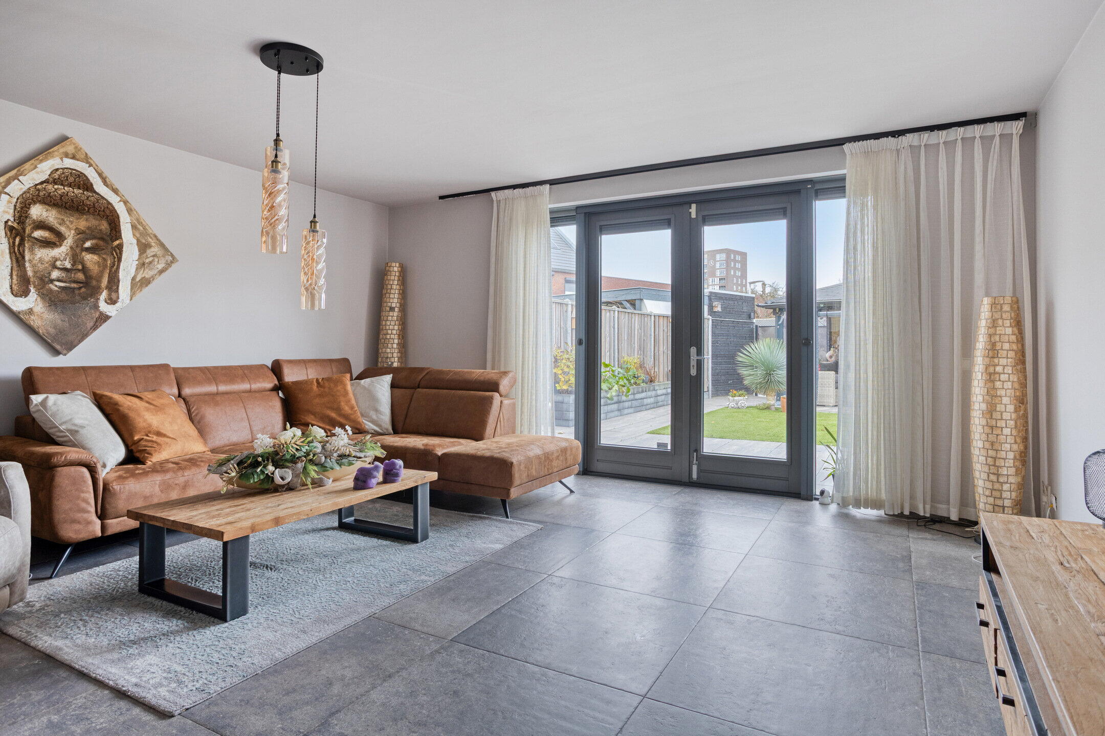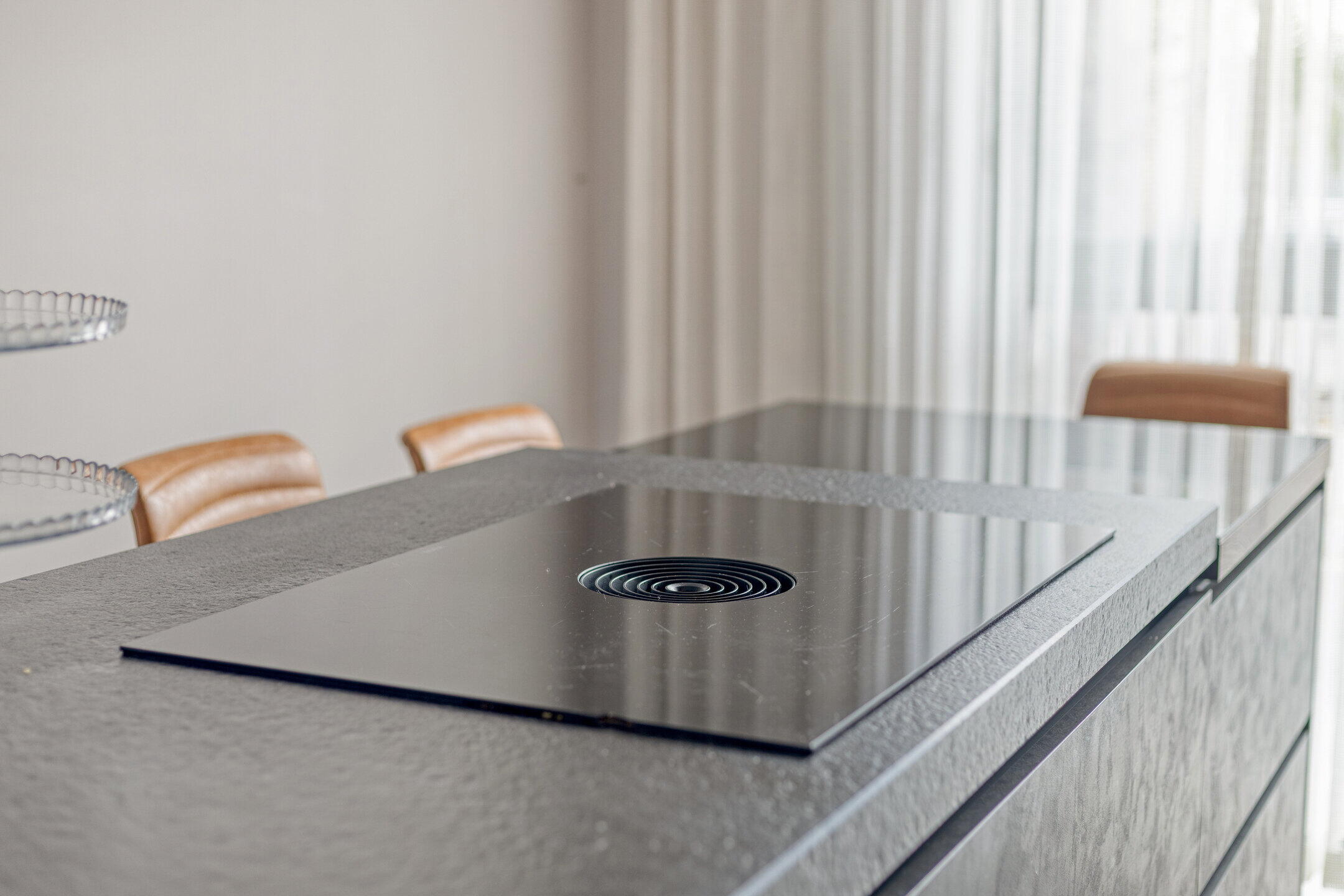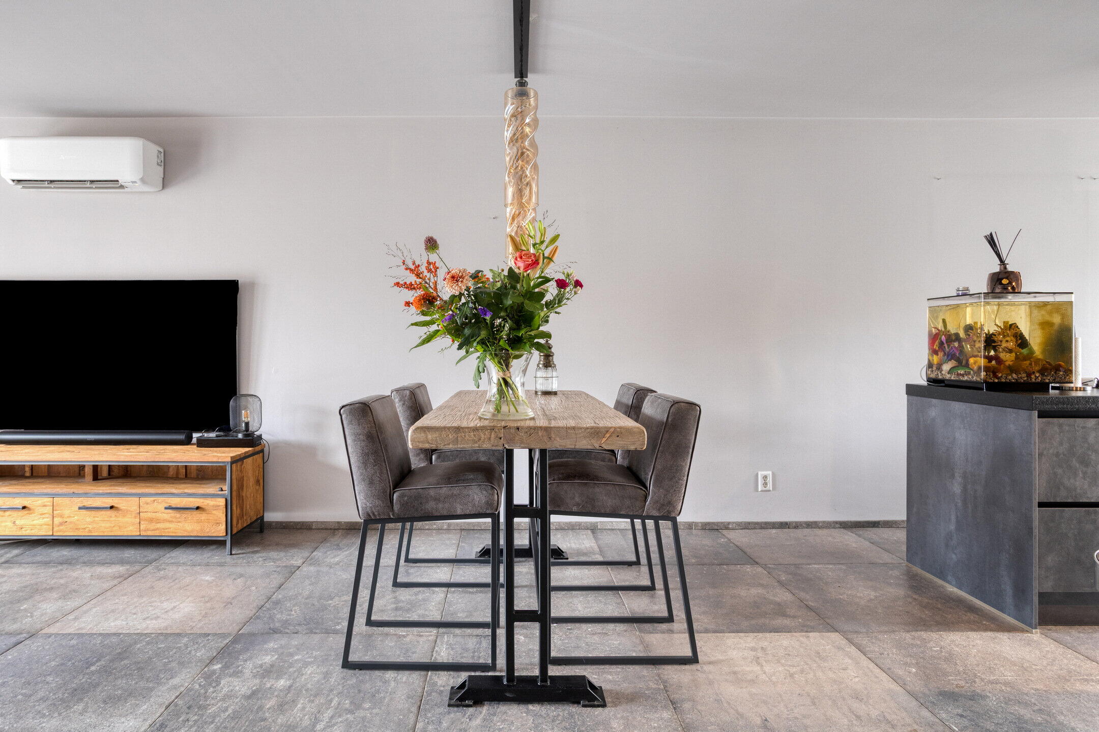 De woonkamer is heerlijk ruim, met een moderne uitstraling dankzij de donkere plavuizenvloer en strakke lichte wanden. Het zitgedeelte bevindt zich aan de tuinzijde met openslaande deuren naar buiten. Tussen de keuken en woonkamer is plek voor een royale eettafel, perfect voor gezellige diners. Fijn detail: er is een handige trapkast én een airco die voor verkoeling zorgt in de zomer. De keuken bevindt zich aan de voorzijde van de woning en is een echte eyecatcher. Donkere kleuren, een modern kookeiland met bar, en natuurlijk luxe apparatuur zoals een Bora kookplaat, oven, combi-oven, koelkast, vriezer, vaatwasser en Quooker. Een droom voor elke kookliefhebber!