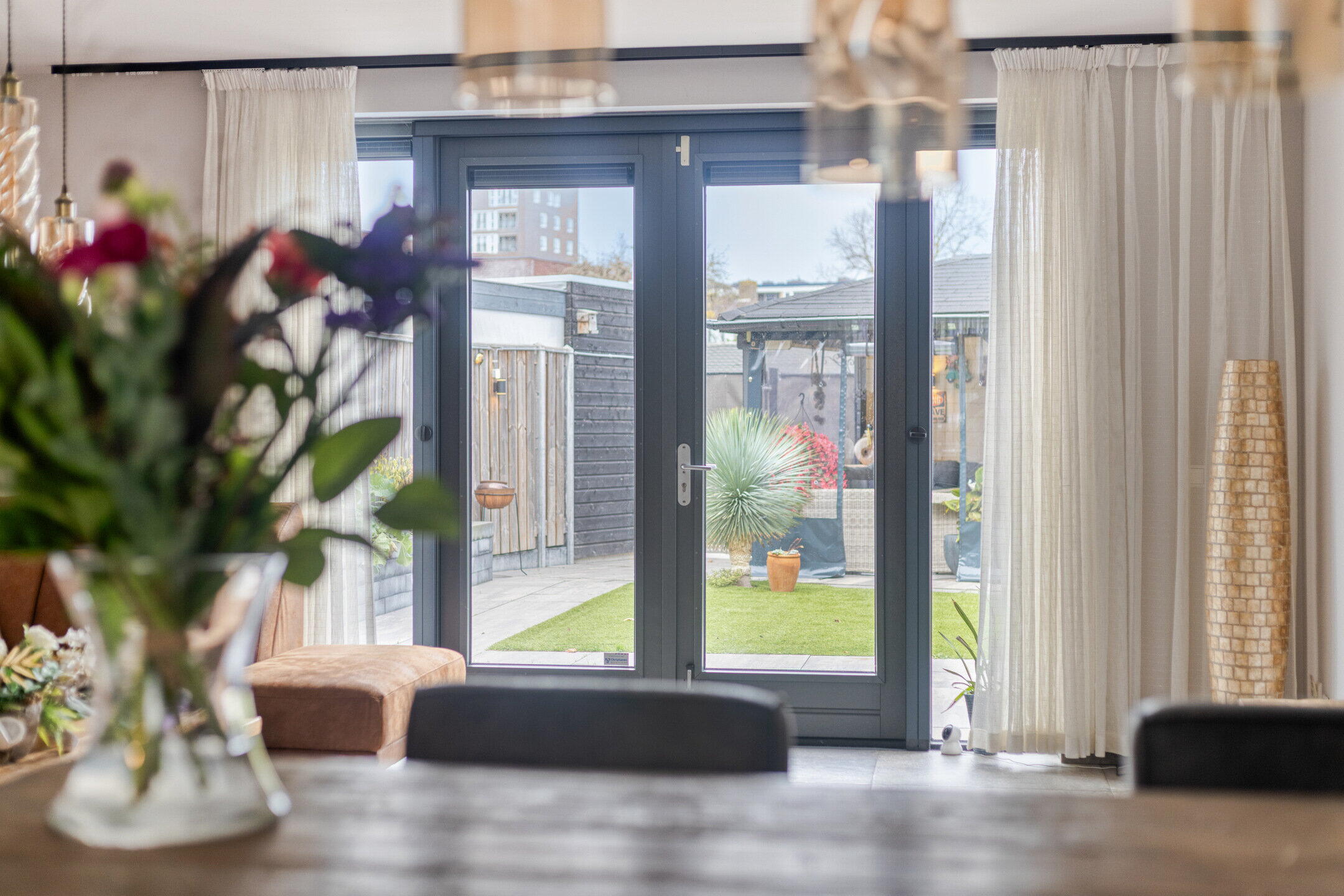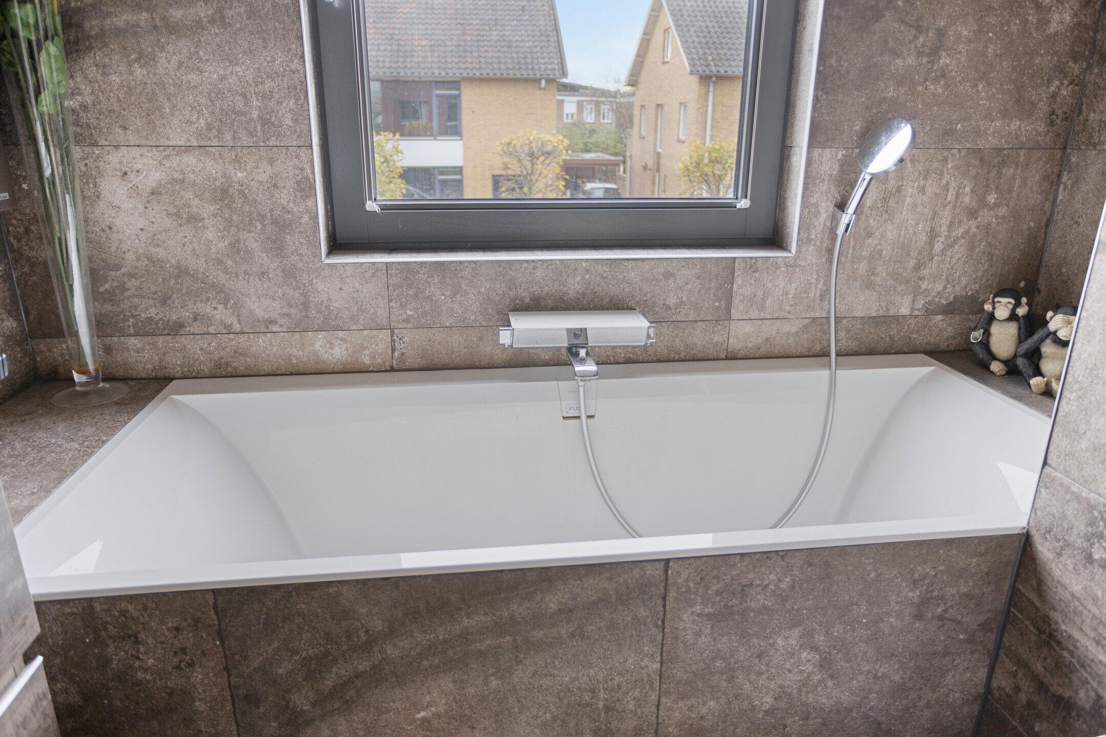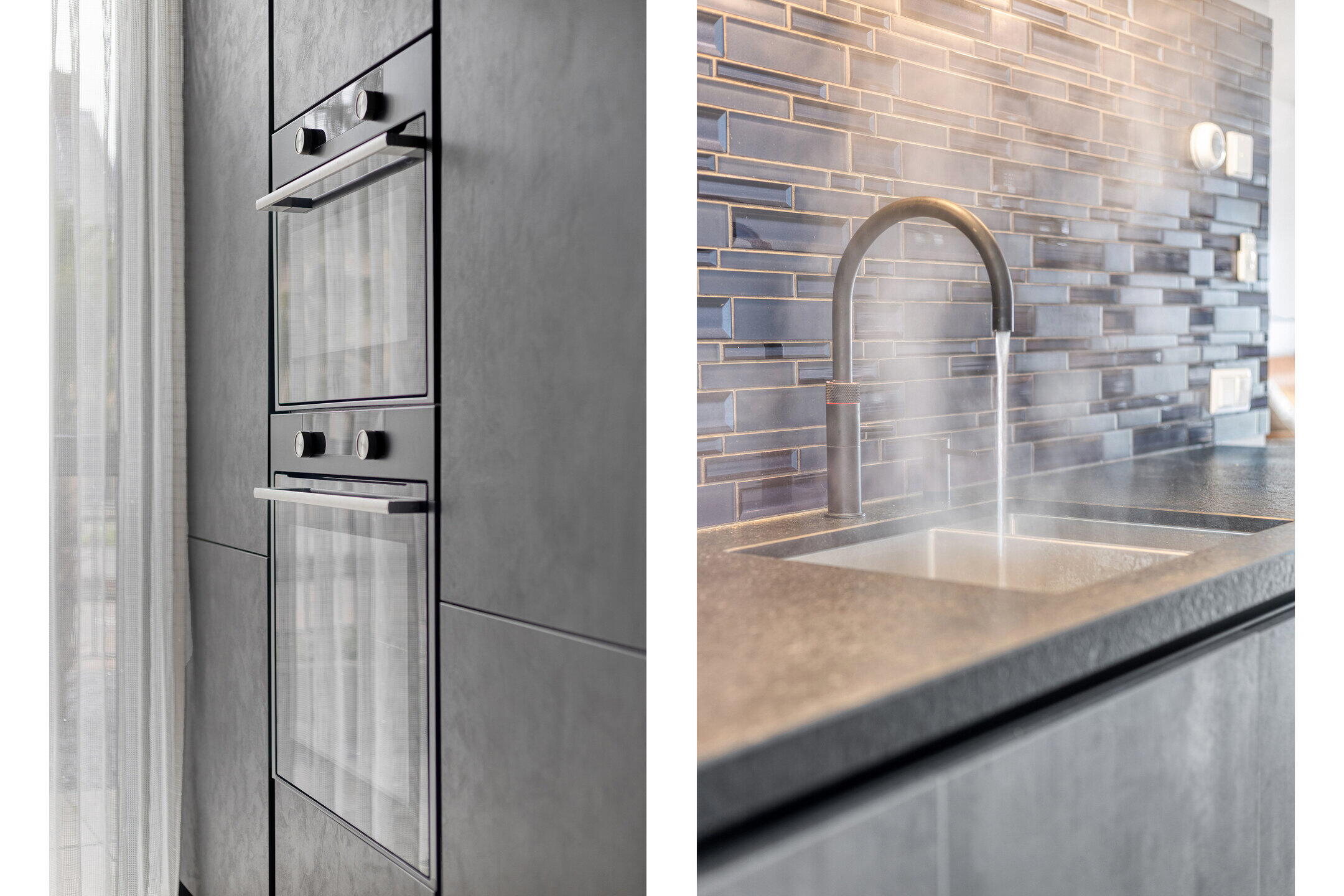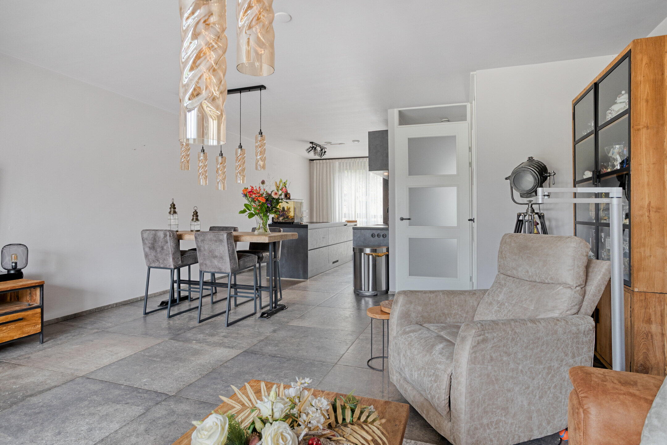 De woonkamer is heerlijk ruim, met een moderne uitstraling dankzij de donkere plavuizenvloer en strakke lichte wanden. Het zitgedeelte bevindt zich aan de tuinzijde met openslaande deuren naar buiten. Tussen de keuken en woonkamer is plek voor een royale eettafel, perfect voor gezellige diners. Fijn detail: er is een handige trapkast én een airco die voor verkoeling zorgt in de zomer. De keuken bevindt zich aan de voorzijde van de woning en is een echte eyecatcher. Donkere kleuren, een modern kookeiland met bar, en natuurlijk luxe apparatuur zoals een Bora kookplaat, oven, combi-oven, koelkast, vriezer, vaatwasser en Quooker. Een droom voor elke kookliefhebber!