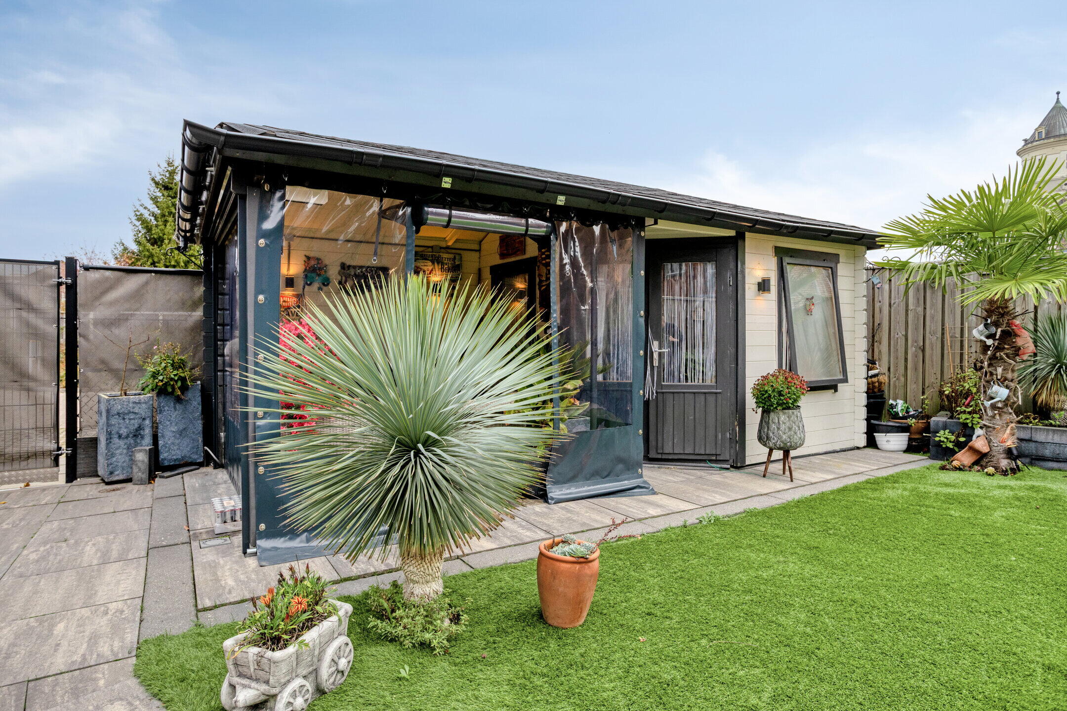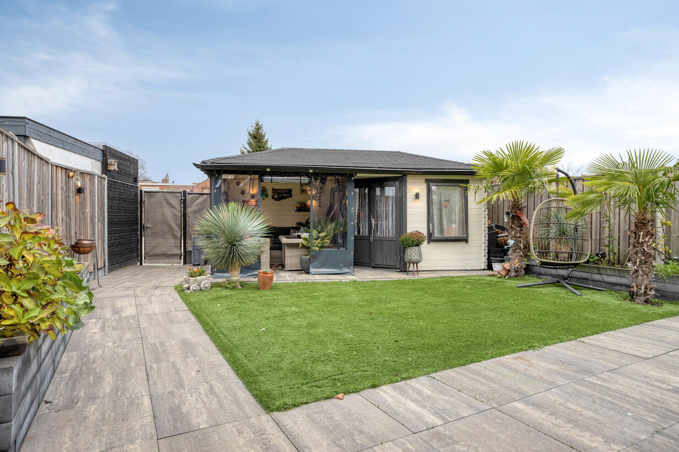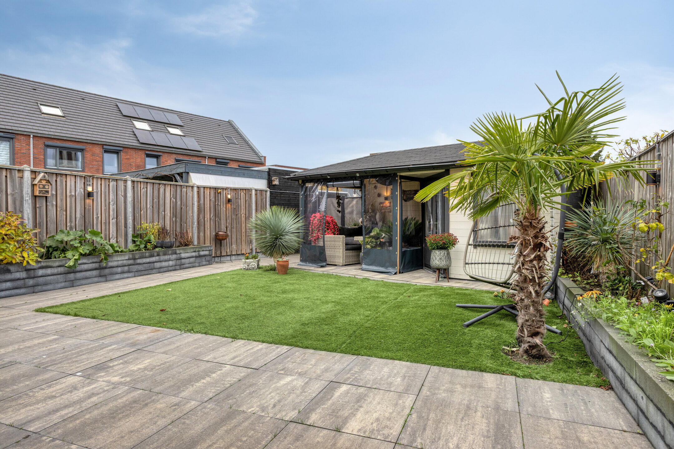 De achtertuin is modern en onderhoudsvriendelijk aangelegd. Direct aan de woning ligt een betegeld terras voor een gezellige loungeplek, verderop een grasveld, plantenborders en houten schuttingen voor de nodige privacy. Achterin vind je een houten berging met overkapping, perfect voor een sfeervolle zithoek of extra opslag. Via de achterom en poort bereik je de eigen parkeerplekken, waarvan één met laadpaal.