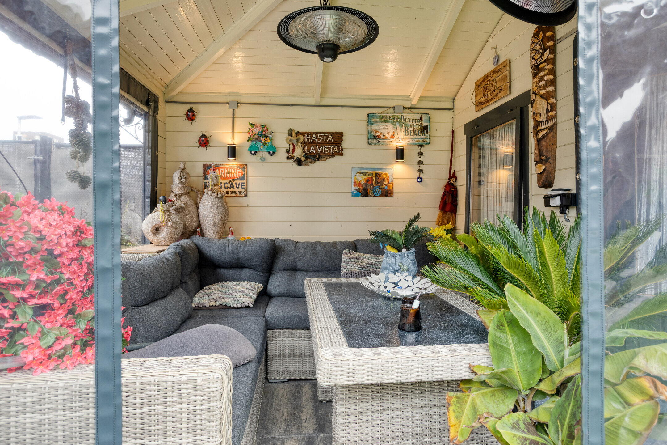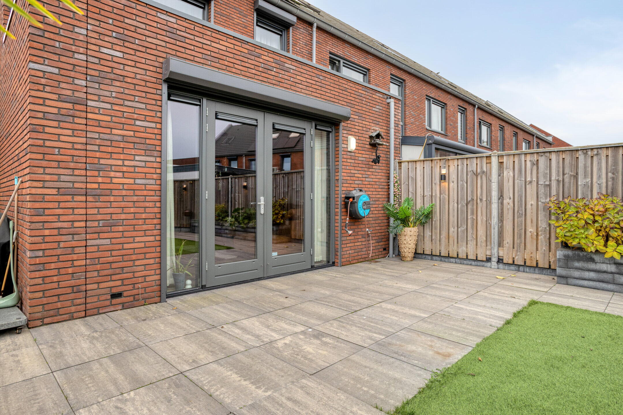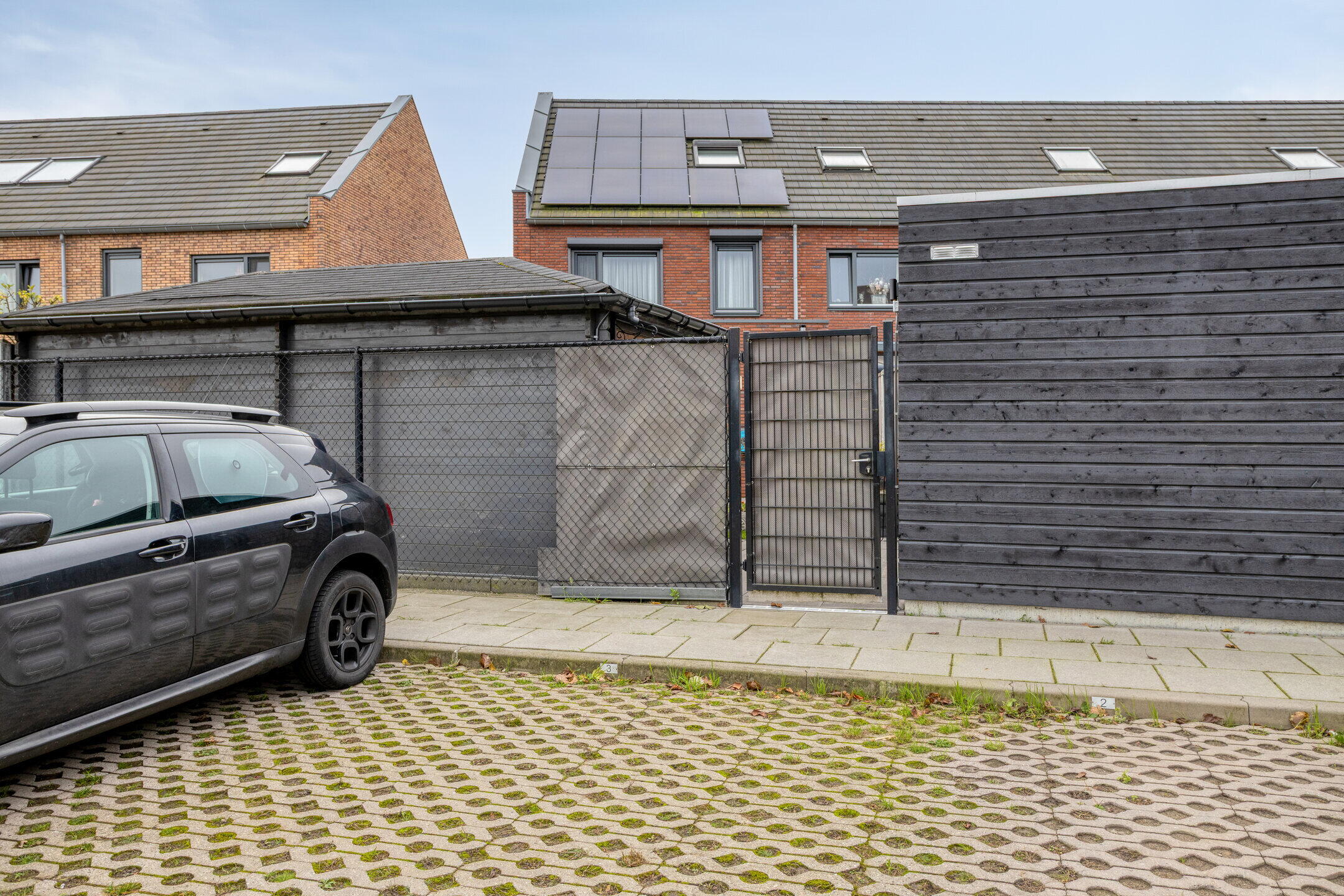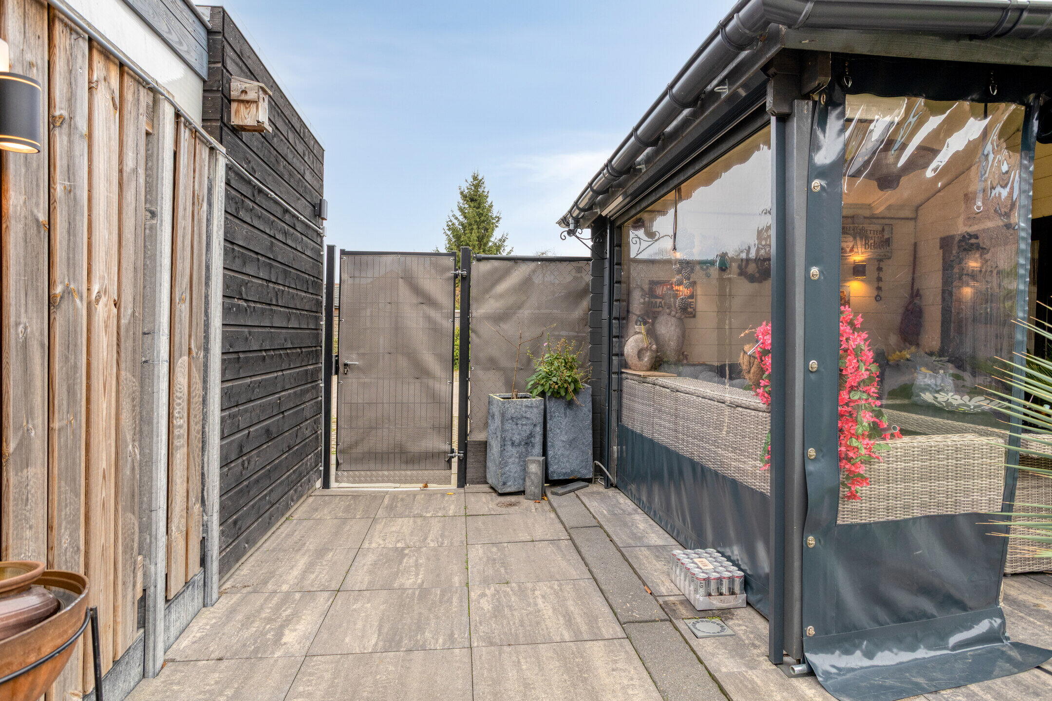 De achtertuin is modern en onderhoudsvriendelijk aangelegd. Direct aan de woning ligt een betegeld terras voor een gezellige loungeplek, verderop een grasveld, plantenborders en houten schuttingen voor de nodige privacy. Achterin vind je een houten berging met overkapping, perfect voor een sfeervolle zithoek of extra opslag. Via de achterom en poort bereik je de eigen parkeerplekken, waarvan één met laadpaal.